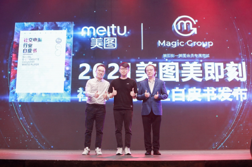 随后,美图公司创始人兼CEO吴欣鸿、美图美即刻创始人兼CTO王志全以及第一财经副总编、第一财经电视副总监、新媒体首席运营官张志清在现场开启了《社交电商行业白皮书》发布仪式!