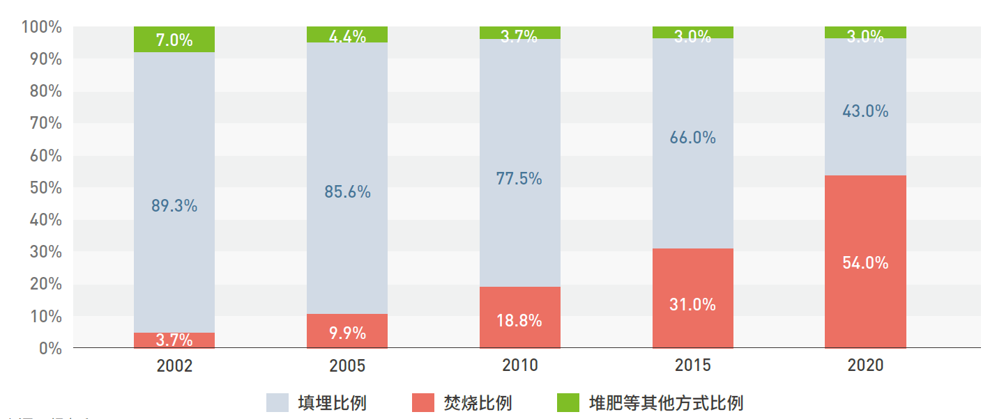 据绿色和平估算,2018年中国生活垃圾产生总量大约为5亿吨,厨余垃圾约占中国城市生活垃圾的一半。在当前中国厨余垃圾的处理方式中,超50%依靠填埋处理,约38%进行了焚烧处理。近年来中国垃圾填埋处理的占比逐年降低,但中国厨余垃圾处理设施能力总体存在一定缺口,中国厨余垃圾管理走向低碳、可持续的未来依然任重道远。