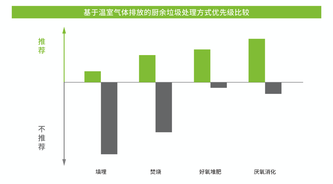 报告通过国内外食物废弃物和厨余垃圾管理与政策案例研究,总结各国在管理创新上值得借鉴的经验,并聚焦生命周期评价(Life Cycle Assessment)环境管理工具,考察分析了不同厨余垃圾处理模式下的温室气体排放、资源能源使用和垃圾资源化利用情况。基于温室气体排放数据,报告建议按照“厌氧消化>好氧堆肥>焚烧>填埋”的顺序优化处理模式,发挥多种技术耦合协同作用,实现厨余垃圾全生命周期低碳管理。