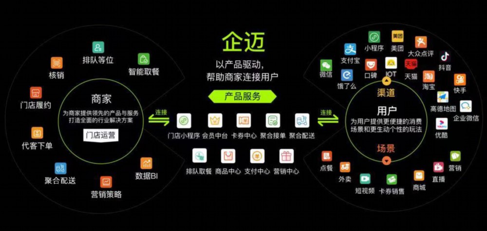 2020年初的一场疫情,让大部分线下门店都受到了影响,也让大家有了数字化的经营意识,从门店运营、人员管理、会员管理、用户消费场景等,逐步由人管到数字化管理,随着移动互联网的发展,市场下沉,在“人”、“货”和“场”的经营当下,怎么经营好用户,成为品牌新的挑战。如何低成本获客、沉淀用户,并运营好用户成为线下门店进阶提升、促进业绩增长的关键点,针对市场新需求,此次企迈从”新“定位,围绕“商家私域用户数字运营”,通过用户到店的场景把用户留存下来,为商家建立一个可持续发展的用户消费生态。