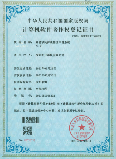 近日,深圳乾元移民有限公司开发的“养老移民护照签证申请系统”,经国家版权局审核,正式获授国家版权局“国家软件著作权登记证书”,并完成了登记和认证工作,《中华人民共和国国家版权局计算机软件著作权登记证书》登记号2021SR1066292。自此,该“养老移民护照签证申请系统”将获得中国版权保护中心的有效保护,这是深圳乾元移民有限公司在计算机软件著作权方面取得的一项新成绩。