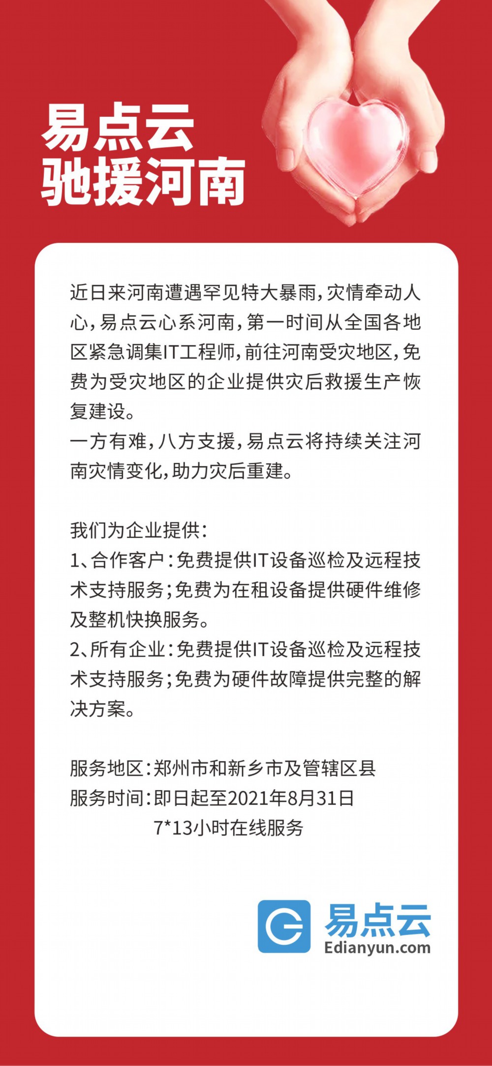 为快速解决企业灾后生产恢复建设工作,即日起至2021年8月31日,易点云升级IT支持服务: