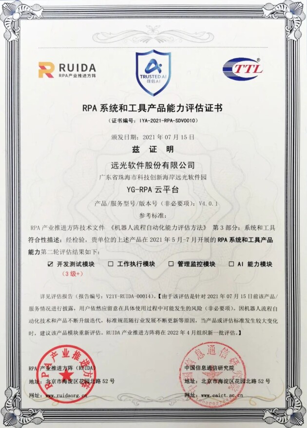 近日,由中国信息通信研究院(中国信通院)、云计算与大数据研究所(云大所)主办的“2021年可信AI成果发布会”在北京召开,大会重点发布了中国信通院RPA 系统和工具应用成熟度的评估结果。经中国信通院技术测试、专家评审等严格的测评流程,远光软件“YG-RPA云平台”通过了“RPA系统和工具产品能力评估”最高级别“3+”级的评测。