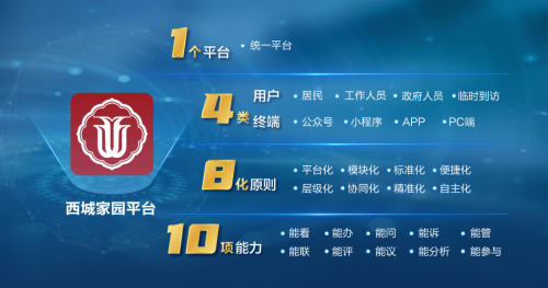 “西城家园”平台以“1+3+N”作为建设理念。“1”即建设一个以居民为中心的区级线上基层社会治理平台,倡导多元参与,形成纵向同力、横向同心的家园共治体系;“3”是构建“区-街-居”三级联动的线上服务体系,打通新时代文明实践中心、区级融媒体中心和政务服务中心三个中心;“N”是以“1+3”为基础,以10项能力(能看、能办、能问、能诉、能管、能联、能评、能议、能分析、能参与)和8化(平台化、模块化、标准化、便捷化、层级化、协同化、精准化、自主化)原则为支撑,整合各类资源,构建N个场景化应用,向居民提供定制化服务。