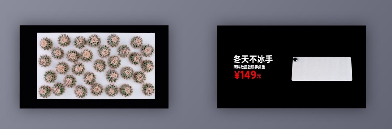 区别于开门见山式的产品介绍,这则产品视频用仙人球、沸水、气球、塑料袋等元素,还原了冬天最具代表性的场景,比如冰冷得让人伸不出手的书桌。通过场景再现,准确地传递出暖桌垫、升降火锅、电暖器、水暖毯的产品特性,向用户展示了小米有品用科技为生活提供的便利。