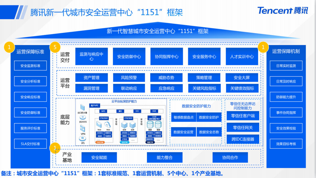 洪春华将腾讯新一代城市安全运营中心的核心理念归纳为四个词:开放、可控、协同、高效。基于这个理念以及腾讯自身在智慧城市建设沉淀的经验,腾讯推出新一代城市安全运营中心“1151”框架,即1套标准规范、1套运营机制、5个中心和1个产业基地。