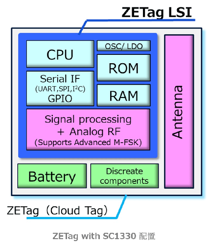 SC1330 是专为这种新型 ZETag 开发,在 LPWA 通信中实现最高水平的性能。 与其他公司提供的典型LPWA产品相比,在相同传输速率下,灵敏度提高了5.3dB。 凭借 Socionext 多年来积累的射频信号处理和 SoC 设计技术的专业知识,CPU、各种外部接口功能和信号处理单元已集成到一个适合 4mm x 4mm 封装的单芯片解决方案中。 新 IC 不仅有助于减少标签产品所需的组件尺寸和数量,还有助于提高质量和可靠性。