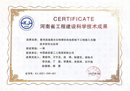 《黄河流域高水位特厚砂层地质地下工程施工关键技术》,通过多间距钢筋笼自动缠绕、高水位特厚砂层地质下泥浆配比、深基坑支护下沉式格构柱安装定位、软弱地基下灌注桩后注浆质量控制等技术,解决了特殊地质下灌注桩、格构柱施工等质量控制难题。累计降低成本42.5万元。该成果先后获得了实用新型专利2项、省级工法1项、省市级QC成果7项等荣誉。