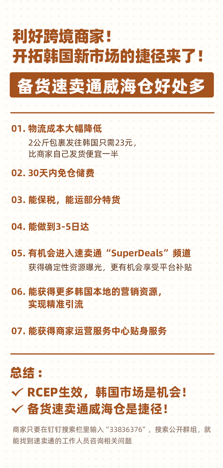 今年跨境电商还有哪些好机会?随着今年RCEP生效,很多跨境商家都把目光瞄准了韩国市场,但该怎么做?提前备货速卖通的威海仓!这是低成本、快速打开韩国市场的捷径。