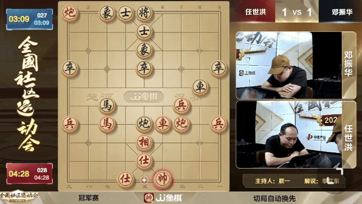 最终迎来的冠亚对决,是本届决赛阶段最年轻的选手邓振华对上最年长的任世洪。开局后,双方稳扎稳打,等待对方的破绽漏棋,直到战成议和。换边再战,黑方邓振华攻击过猛,忽略了红方任世洪的潜在反击,进入双车马炮对双车马炮时,红方取得优势,最终斩获本届赛事的冠军。