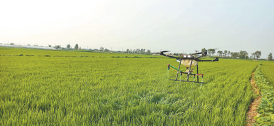 农用无人机在无锡莲花荡农场稻田里喷洒农药。