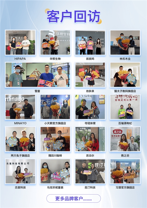 截至到目前,慧博科技已连续十年为商家提供针对性的保障服务,十年累计上门拜访客户服务数量超 1.5万+ 家,大促节点累计拜访客户服务超2000+家,节点驻场服务客户累计超100家,始终坚持做有温度的客户服务,让客户更放心的全力以赴追增量。