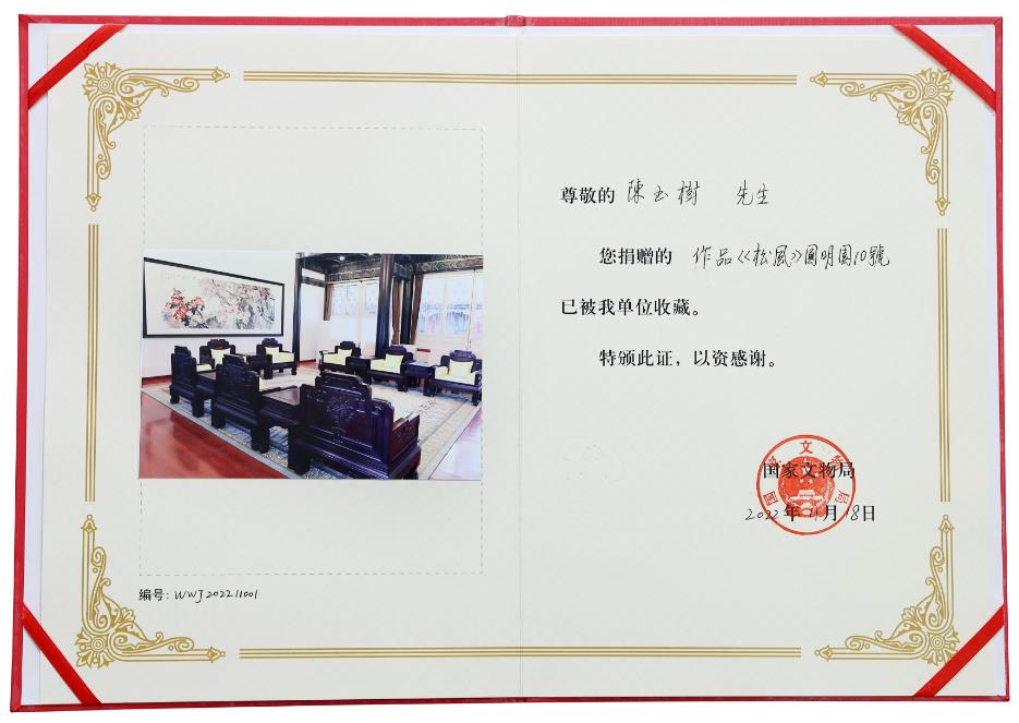 中新网7月31日电 日前,圆明园《松风》10号作品入藏仪式在国家文物局举行,向作品主创、知名古典家具艺术家陈玉树颁发了收藏证书。
