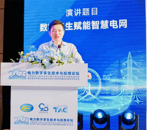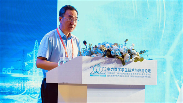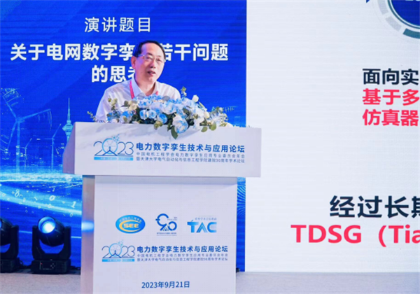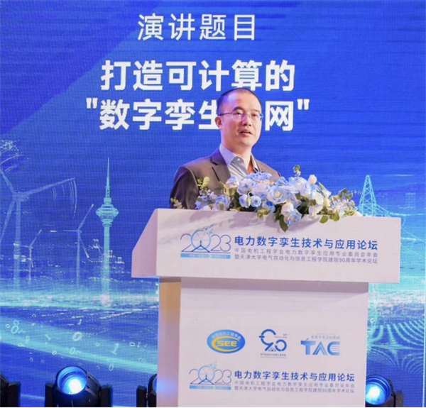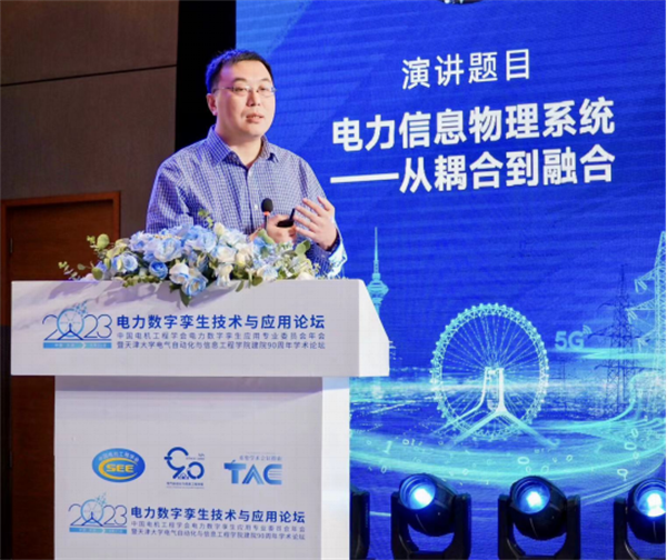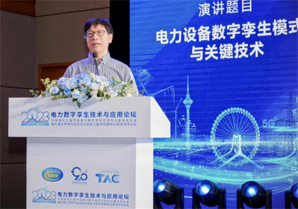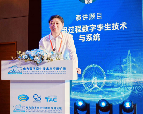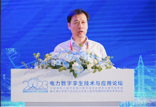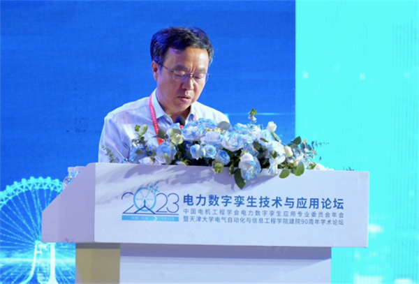 2023年9月21日,“中国电机工程学会电力数字孪生应用专业委员会年会暨天津大学电气自动化与信息工程学院建院90周年学术论坛”在天津召开。会议由中国电机工程学会电力数字孪生应用专业委员会主办,中国电力科学研究院有限公司、国网天津市电力公司、天津大学电气自动化与信息化工程学院承办,深圳优立全息科技有限公司、腾讯集团协办。电力数字孪生应用专委会顾问、中国工程院邬贺铨院士、线上参会,中国电机工程学会会士、中国工程院王成山院士,中国电机工程学会副秘书长申彦红,天津大学电气自动化与信息工程学院院长谭超,国网天津市电力公司副总经理郭向军,中国电力科学研究院有限公司三级顾问陈竟成,电力数字孪生应用专委会主任委员赵鹏,副主任委员余建国、温志鹏、蒲天骄以及来自能源电力、数字孪生等企业、科研院所和高校等单位共计200余名领导和专家现场参会。