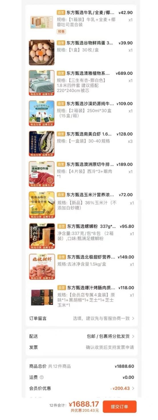 有东方甄选APP用户晒出注册会员后的订单截图,当天购买1888元的商品在享受会员优惠后,可直接优惠200.43元,相当于“一单回本”。有消费者直言,付费会员卡适合“囤货党”,一次下单就值回年卡全部费用。
