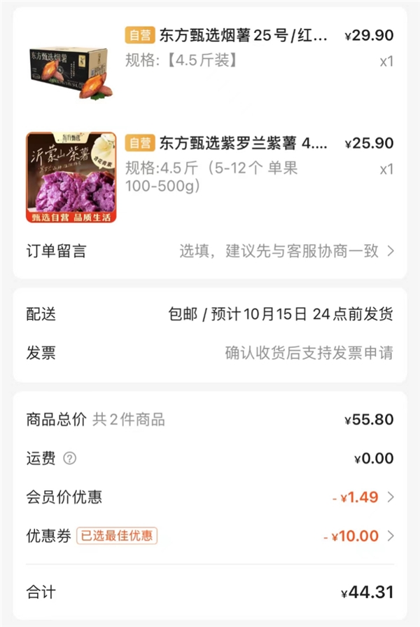 除大额订单能得到高额优惠外,还有消费者发现,年卡会员的88折权益可以叠加一张10元优惠券一起使用。还有网友晒单介绍下单“薅羊毛”攻略,购买东方甄选自营烟薯与紫薯,原本需要55.8元,在使用会员价折扣与开卡赠送的优惠劵减免后,只需44.31元就能拿到手。公开资料显示,东方甄选年卡会员可使用的优惠券,包括全年12张会员券、66元入会礼等。