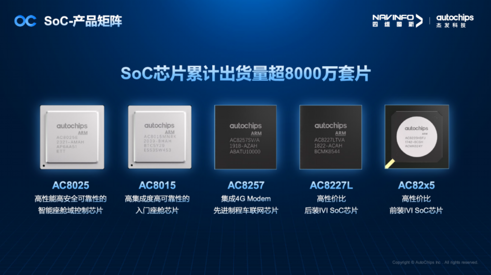 AC8015是杰发科技首颗自主研发的高集成度高可靠性的入门级智能座舱芯片,可用于开发一芯多屏入门级座舱、车载信息娱乐系统、Display Audio、AR-HUD、虚拟仪表等座舱域产品,累计出货量超百万颗,合作客户覆盖国内90% OEM厂商,大幅提升了智能座舱装配率。AC8025是杰发科技新一代高性能高安全可靠性的智能座舱域控芯片,采用(8+2)CPU组合,内置高性能、满足座舱域AI应用的NPU,最多可支持7屏显示,可以大幅提升智能座舱的驾乘体验。AC8025已成功点亮,将于2024年初量产,并在多个汽车制造商的新车型中得到应用。这一突破性创新将加速汽车行业向智能座舱的转型。