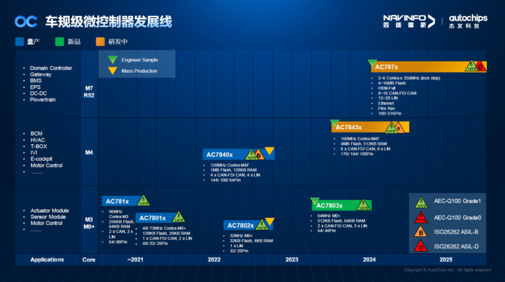 目前,杰发科技MCU产品线全部通过车规认证,出货量超过4000万颗,遥遥领先国产车规级MCU厂商。其中,AC7840x和AC7870x系列产品达到功能安全要求,并满足国内外信息安全最高等级需求,可广泛应用在对功能安全等级要求最高的动力底盘域、新能源三电,以及全新电子电气架构下的区域控制器等场景中。同时,AC7840x和AC7870x支持主流AUTOSAR生态合作伙伴,包括普华、东软睿驰、经纬恒润、Vector、EB、ETAS等,并提供符合功能安全ASIL等级的MCAL及配套配置工具,为用户提供便捷高效的开发体验。