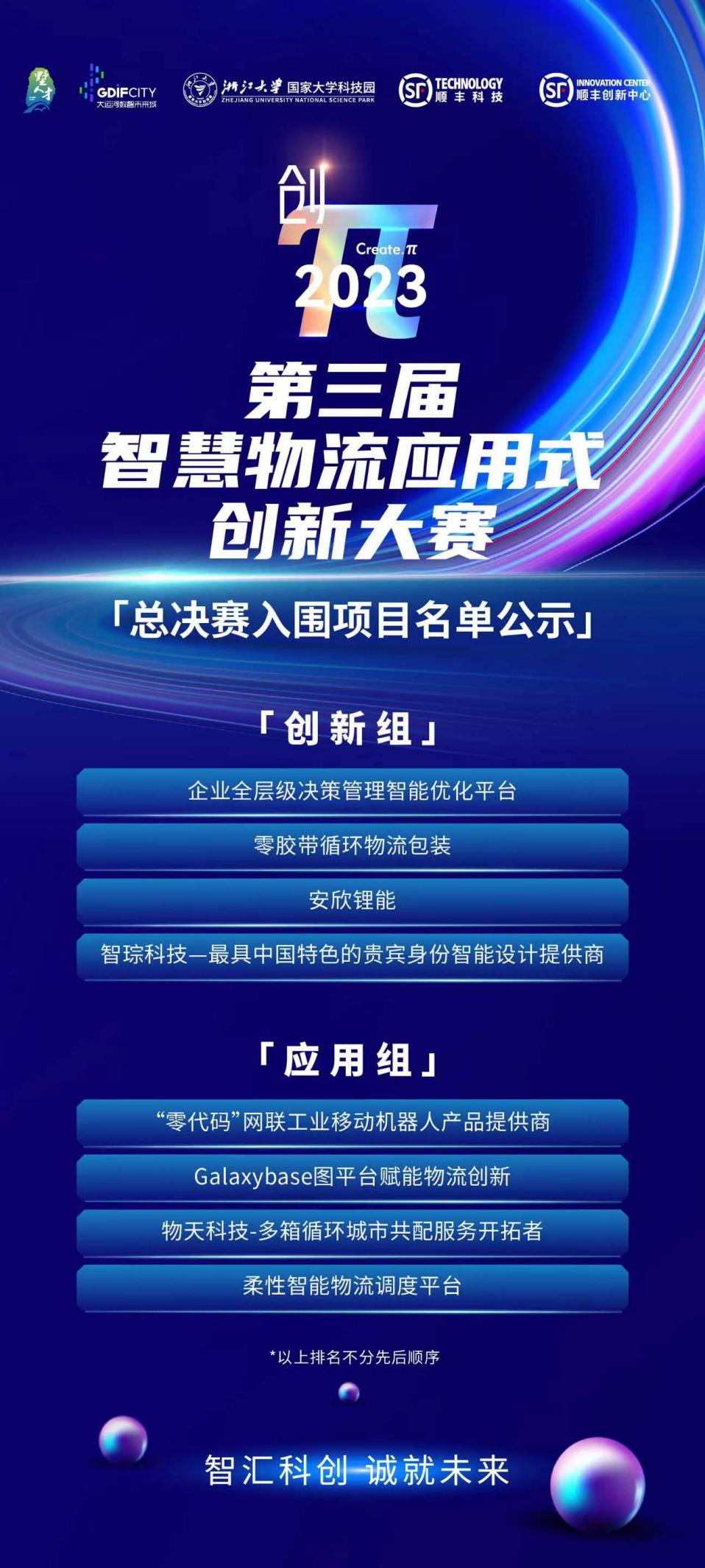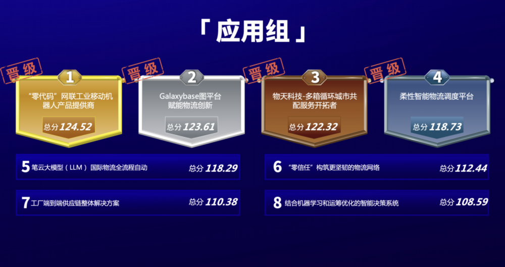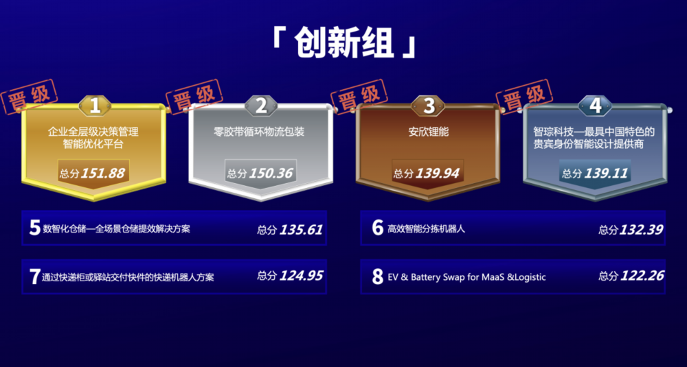 最终,创新组晋级队伍有:企业全层级决策管理智能优化平台(151.88分)、零胶带循环物流包装(150.36分)、安欣锂能(139.94分)、智琮科技-最具中国特色的贵宾身份智能设计提供商(139.11分)。应用组晋级队伍有:“零代码”网联工业移动机器人产品提供商(151.88分)、Galaxybase图平台赋能物流创新(123.61)、物天科技-多箱循环城市共配服务开拓者(122.32)、柔性智能物流调度平台(118.73)。这8组项目将在总决赛展开激烈较量。