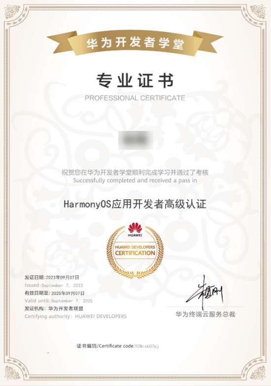 经过3天的理论+实操培训,生态技术伙伴们成功考取了由华为官方颁发的《HarmonyOS应用开发者高级认证》证书,该证书用于认证开发者已具备独立设计和开发HarmonyOS应用的能力。