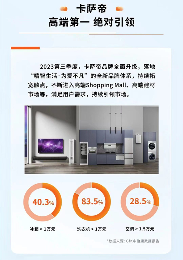 消费升级时代,高端家庭需要的已经不仅仅是家电硬件,而是集科技感、空间感、场景感于一体的生活方式。以用户需求为核心方向,卡萨帝品牌全面升级,落地“精智生活·为爱不凡”的全新品牌体系,并持续拓宽触点,不断进入高端Shopping Mall、高端建材市场等,满足用户需求,持续引领市场。