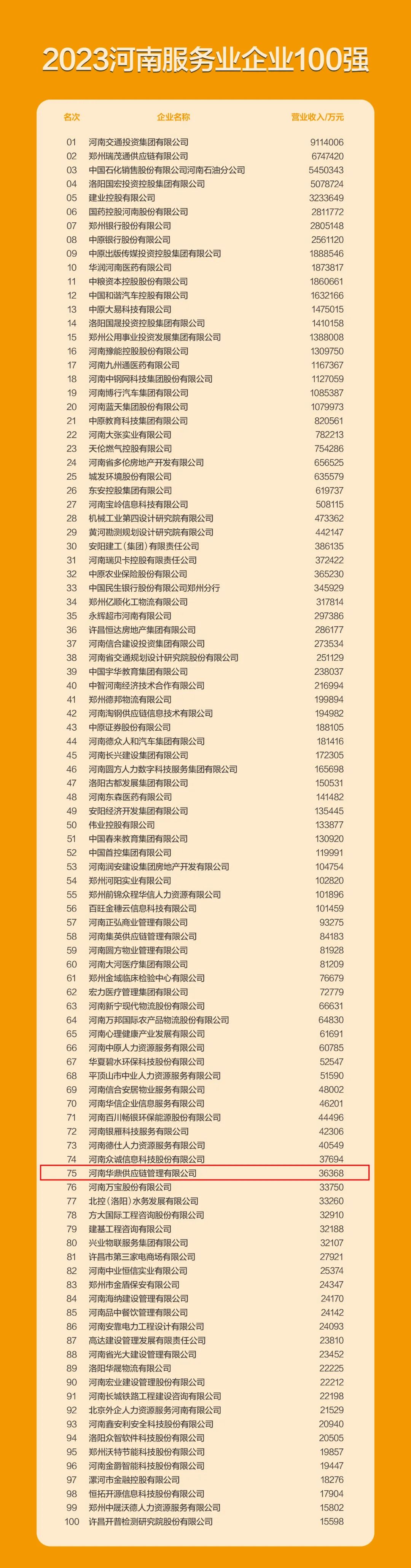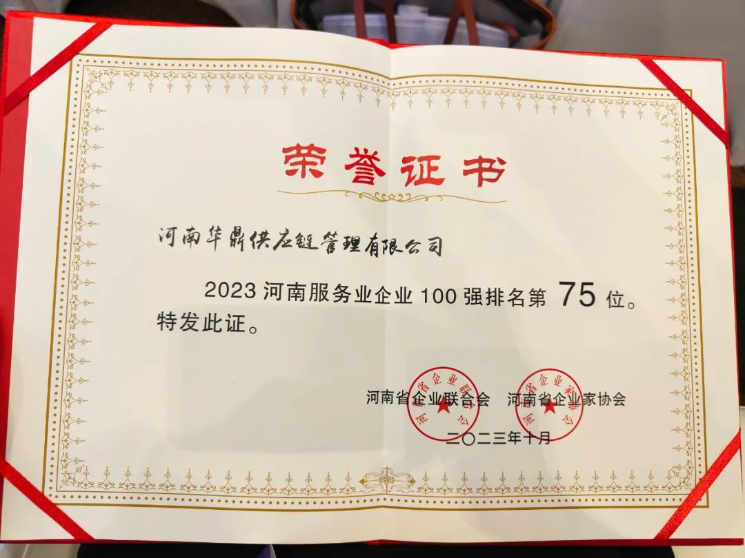河南华鼎供应链被河南省企业联合会、河南省企业家协会评为“2023河南服务业企业100强”。