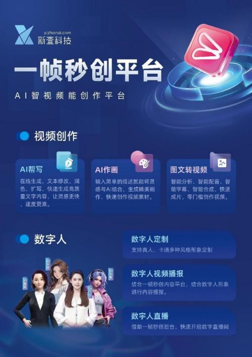新壹科技打造的新壹视频大模型作为国内首款视频垂直大模型,是在通用大模型基础上,深入挖掘视频化场景需求研发的以视频生成为核心的多模态AIGC模型,拥有从脚本生成、素材匹配、智能剪辑配音到数字人播报的AI全流程视频生产能力。目前,以其驱动的产品和服务已覆盖销售、营销、商务等各领域多个细分场景,可大幅提高各垂直领域的视频创造力和生产力。