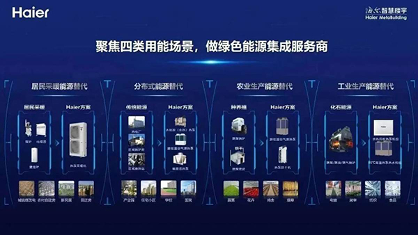 事实上,在具体的应用场景中,用户的用能需求与目标都是不一样的,需要针对具体使用场景进行方案定制。目前,海尔智慧楼宇已推出居民采暖能源替代、分布式能源替代、农业生产能源替代、工业生产能源替代四大场景方案,实现用能替代场景的方案定制化。