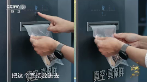 为感受真空保鲜科技的魅力,节目中多位主持人亲自上阵体验海信璀璨真空冰箱503的一键真空功能,将食材装入真空袋或真空盒中,轻触冰箱门体上的按键,即可完成真空。真空处理可为食材提供绝佳储存环境,完美锁住食材鲜味与营养。