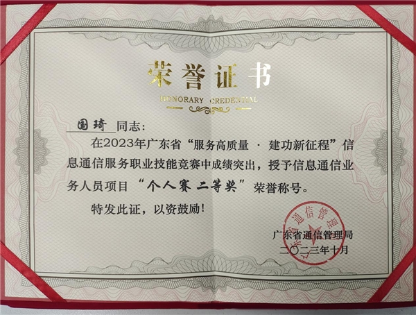 今年7月,国琦接到广东省管局开展“服务高质量·建功新征程”的通信服务职业技能竞赛通知,随即开始筹备深圳选拔赛。她在完成本职工作之余,认真参加广东联通组织的赛前培训,锚定目标,不断巩固专业知识、反复打磨服务技能。在比赛中,她条理清晰、反应灵敏、沉着冷静,个人展示落落大方,选题作答一丝不苟,经过层层选拔和多个环节激烈角逐,最终在广东省通信服务职业技能竞赛中斩获个人二等奖和团队三等奖的成绩。