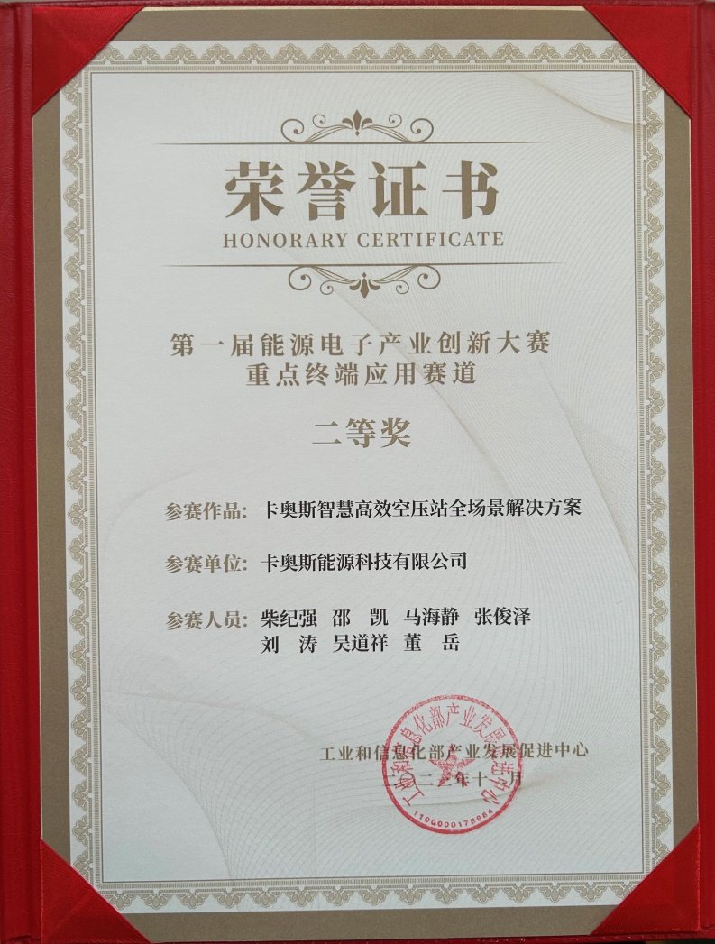12月16日,工业和信息化部产业发展促进中心组织开展的全国第一届能源电子产业创新大赛全国总决赛在江苏省溧阳市举行。本次评选在重点终端应用分赛道方面共征了集产、学、研单位共232件参赛作品,涉及数字化赋能、绿色降碳、能源综合利用、工业绿色微电网、电力电子装备技术及应用、新兴领域六大领域。在“重点终端应用分赛道—数字化赋能领域”,作为空压行业唯一入围总决赛单位,卡奥斯能源凭借“智慧高效空压站全场景解决方案”成功斩获全国二等奖。
