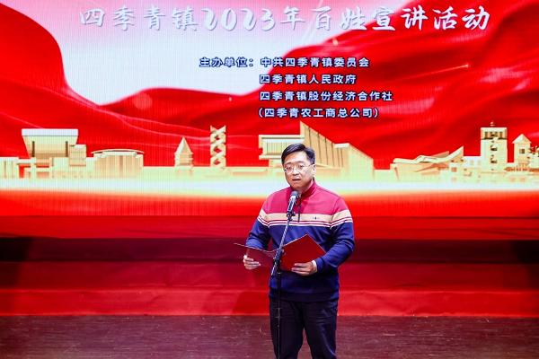 2023年12月22日,四季青镇成功举办“强国复兴有我‘青春’生生不息”2023年百姓宣讲活动,共有来自四季青镇各条战线的老党员、老干部、公安干警、创业青年、学生代表和志愿者等18位宣讲员,从幕后走到台前,通过“宣讲+文艺+文化”的方式,从党建引领、经济自信和共建共享三个方面,以“小切口”展现“大视野”,讲述他们眼中四季青日新月异的发展变化;以“小人物”诠释“大时代”,绘就新时代四季青人民拼搏奋斗的“壮美图景”;以“小故事”阐述“大理论”,通过群众喜闻乐见的方式传播党的创新理论、引领社会文明风尚,本次宣讲共有420余名观众现场参与,共38.69万人通过线上直播方式观看了宣讲活动。