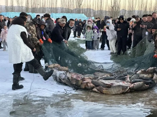 冬捕现场,冬捕第一网捕获3000斤左右的鱼,其中有鲤鱼、草鱼、花鲢、白鲢多个品种,头鱼达25斤,今年乌梁素海冬捕喜获丰收。