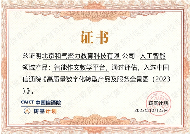 近日,中国信息通信研究院(以下简称“信通院”)更新发布《2023高质量数字化转型产品及服务全景图(10月-12月份新增入图产品)》(以下简称“《全景图》”)。作为科技服务教育数字化的先行企业,和气聚力教育科技自主研发的“和·AI”智能作文教学平台成功入选《全景图》人工智能领域。