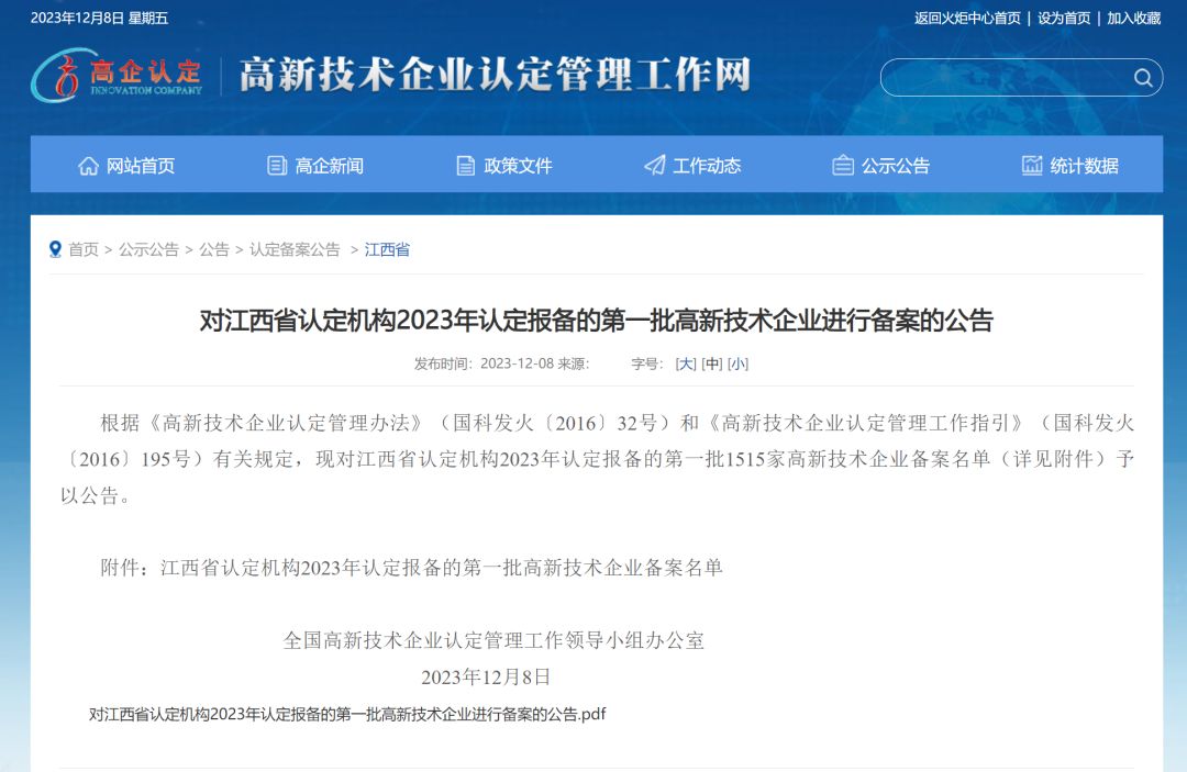 12月8日,全国高新技术企业认定管理工作领导小组办公室发布“江西省2023年第一批高新技术企业备案名单,宏盛建业集团顺利通过国家高新技术企业认定。