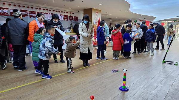 “我刚刚玩了个环保卫士的游戏,还学到了垃圾分类知识,太开心啦!”“我最喜欢那个眼疾手快的游戏,现场还教我们如何抓棍!”“那边还有冰壶,好多好玩的!”在“童颜闹春”活动区,特色民俗活动“投壶、射箭、套圈”等让孩子们直呼“玩得过瘾”,让现场居民感受历经千年的元宵文化。