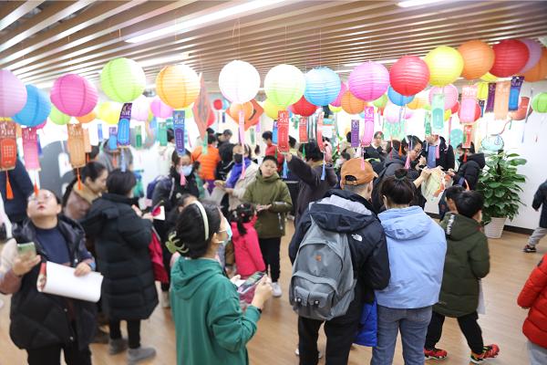 欢乐闹元宵,怎么能少得了灯谜呢!在实践所二楼“彩灯聚福”区,200多盏带有猜灯谜卡片的五光十色灯笼吸引了不少的小朋友们驻足。家长带着孩子,全家齐上阵,争相竞猜,现场热闹非凡。大家绞尽脑汁,仔细斟酌谜面,纷纷沉浸在谜底竞猜的乐趣中。