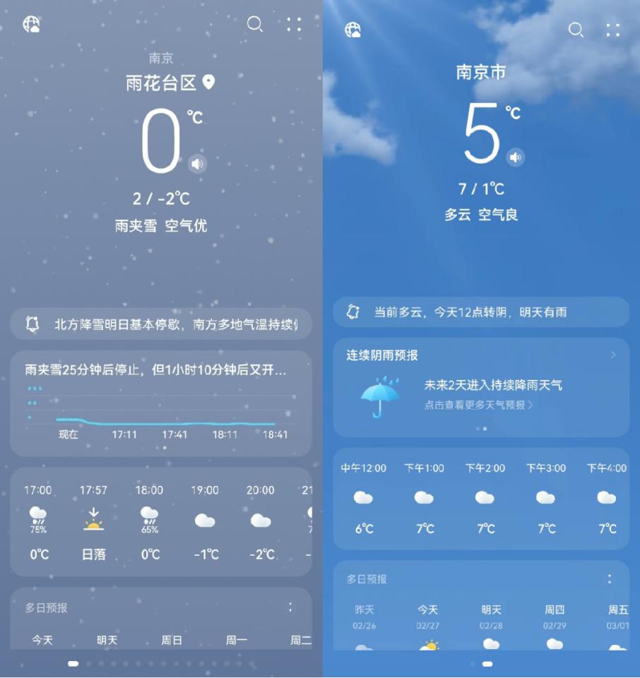 龙年首场寒潮天气踩着陆续返工的时间登场,伴随而来的雨雪、降温天气成为不少用户通勤途中的“拦路虎”。当出行高峰遇上寒潮,华为天气为广大用户提供准确的雨雪预报和贴心及时的提醒服务,帮助用户提前且直观地了解雨雪状况。