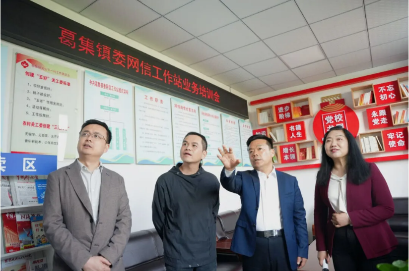 葛集镇在砀山县率先建设网信工作站,调研组一行实地查看了该镇网信工作站的办公场所、制度建设及软硬件设施配备情况,听取了葛集镇党委书记、网信工作站站长戴红梅关于网络文明建设、网络普法宣传、农村电商培育等方面的工作汇报,并进行座谈交流。尉成辉表示,宿州在全省率先推进网信工作站建设,夯实网信工作基层基础,在服务乡村经济社会发展方面发挥了更好的作用。金粟高度评价了葛集镇网信工作站在繁荣乡村文化、赋能乡村振兴、提升乡村治理效能等方面的经验做法,并表示,宿州在基层网信机构建设方面的探索创新有举措、有亮点、有成效,值得学习借鉴。