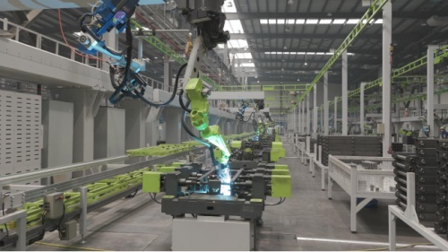 在涂装车间,定制化涂装换色可在1小时之内完成,数字化调试可实现1人同时高效率调试6台设备,通过智能工装、智能设备快速切换,柔性化生产,可高效高质量满足端到端定制化需求。更值得一提的是,这个园区采用了屋面光伏、涂装VOC零排放,也在每一个焊接机器人头顶安装了排尘除烟系统,真正实现了生产制造过程的节能减排和绿色制造。